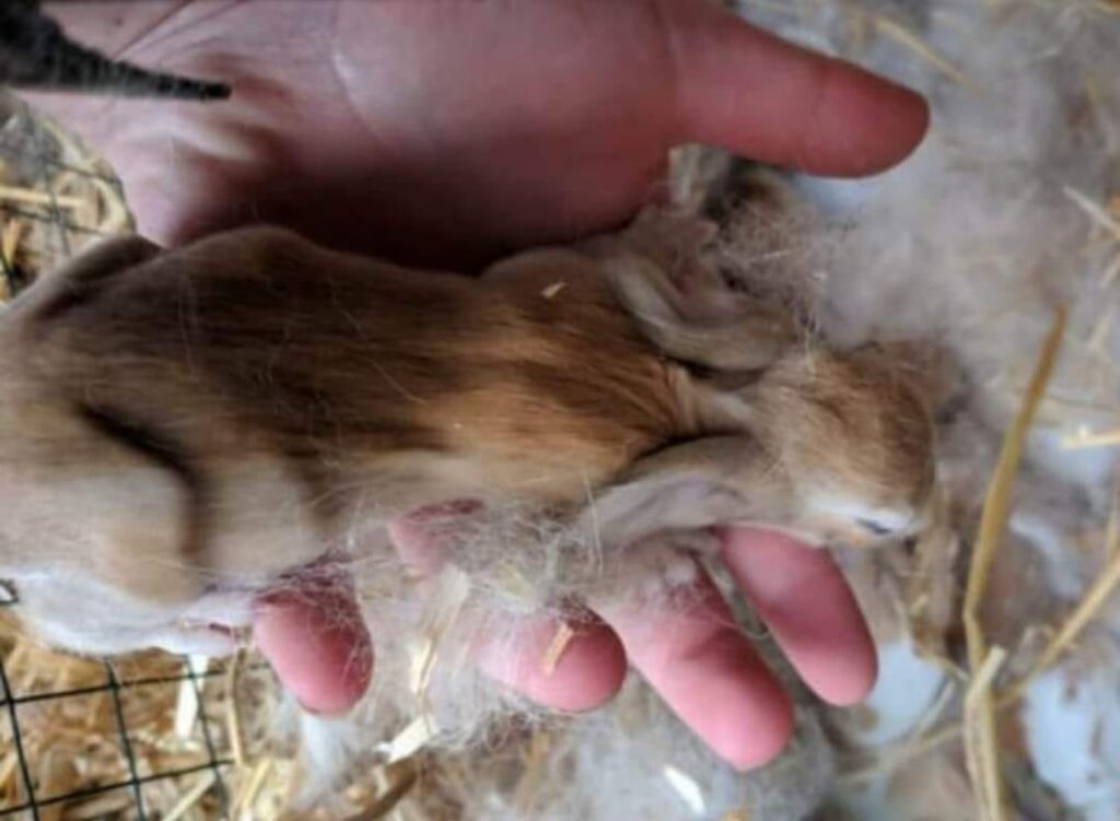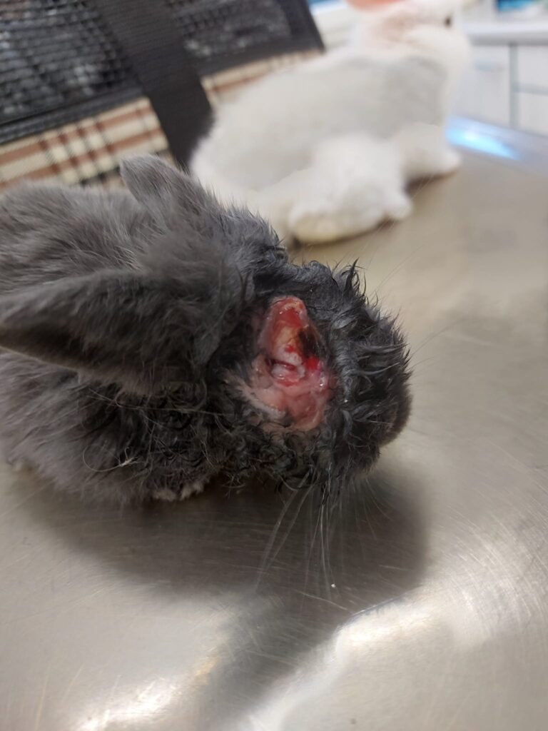 Schlimme Kopfverletzung eines Kaninchenwelpen, durch eine massive Bissverletzung . Ursache hierfür war ein Nistplatzmangel und Stress.