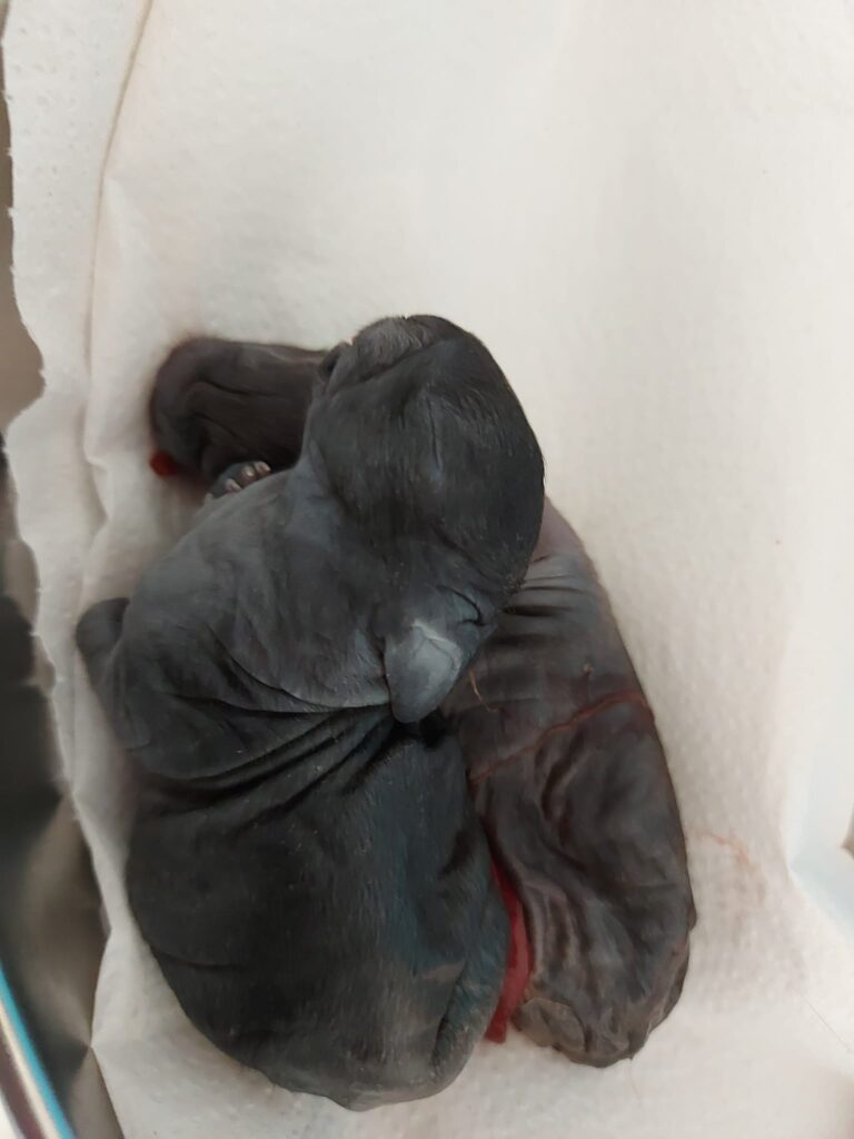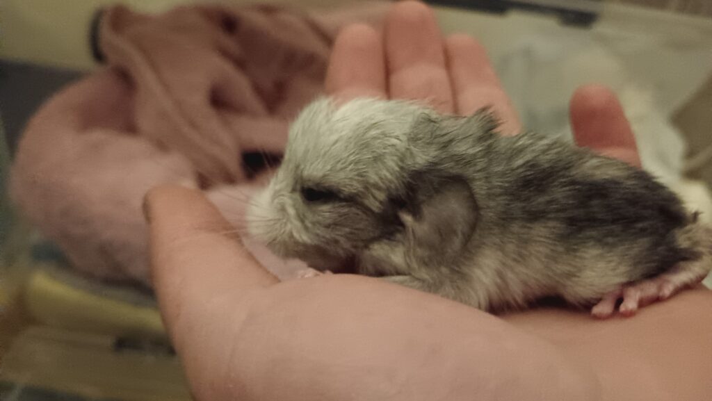 Chinchilla nach Notkaiserschnit. Leider hatte der Welpe einen Schwanzabriss, durhc eine missglückte Lagekorrektur seitens des Tierarztes erleiden müssen.