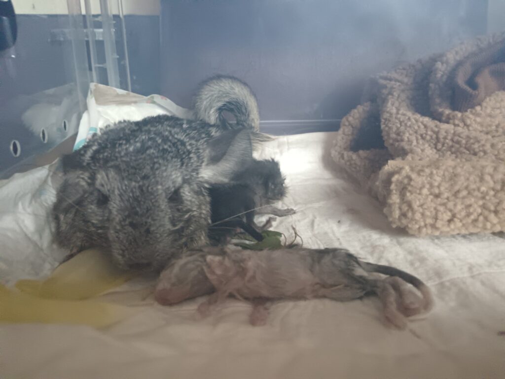 Schwergeburt bei eine Subadulten Chincilla mit Lagekorrektur, leider überlebte nur eines der Zwillinge. Der Tierarzt hatte es abgewiesen, weil dies wie bei einen Meerschweinchen sein soll, nur anders…